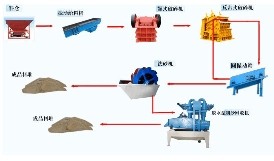 對于一套完整的水洗砂生產(chǎn)線來說,其除了包含有洗砂機這一核心洗砂設(shè)備外,其肯定還會含有制砂機,甚至還有粗、細碎破碎機(通常情況下,多為顎式破碎機與反擊式破碎機),用于完成對大塊砂石物料的粗、細碎作業(yè)。具體各設(shè)備之間配合生產(chǎn)工藝流程如下: